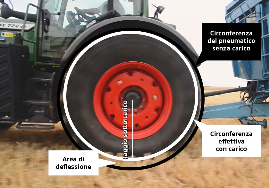 Suggerimento: Per ottenere una circonferenza di rotolamento dinamico precisa, è necessario regolare perfettamente la pressione di gonfiaggio in funzione del carico del trattore, tenendo conto anche della velocità di marcia. Questi dati sono indicati sui manuali tecnici dei produttori.
